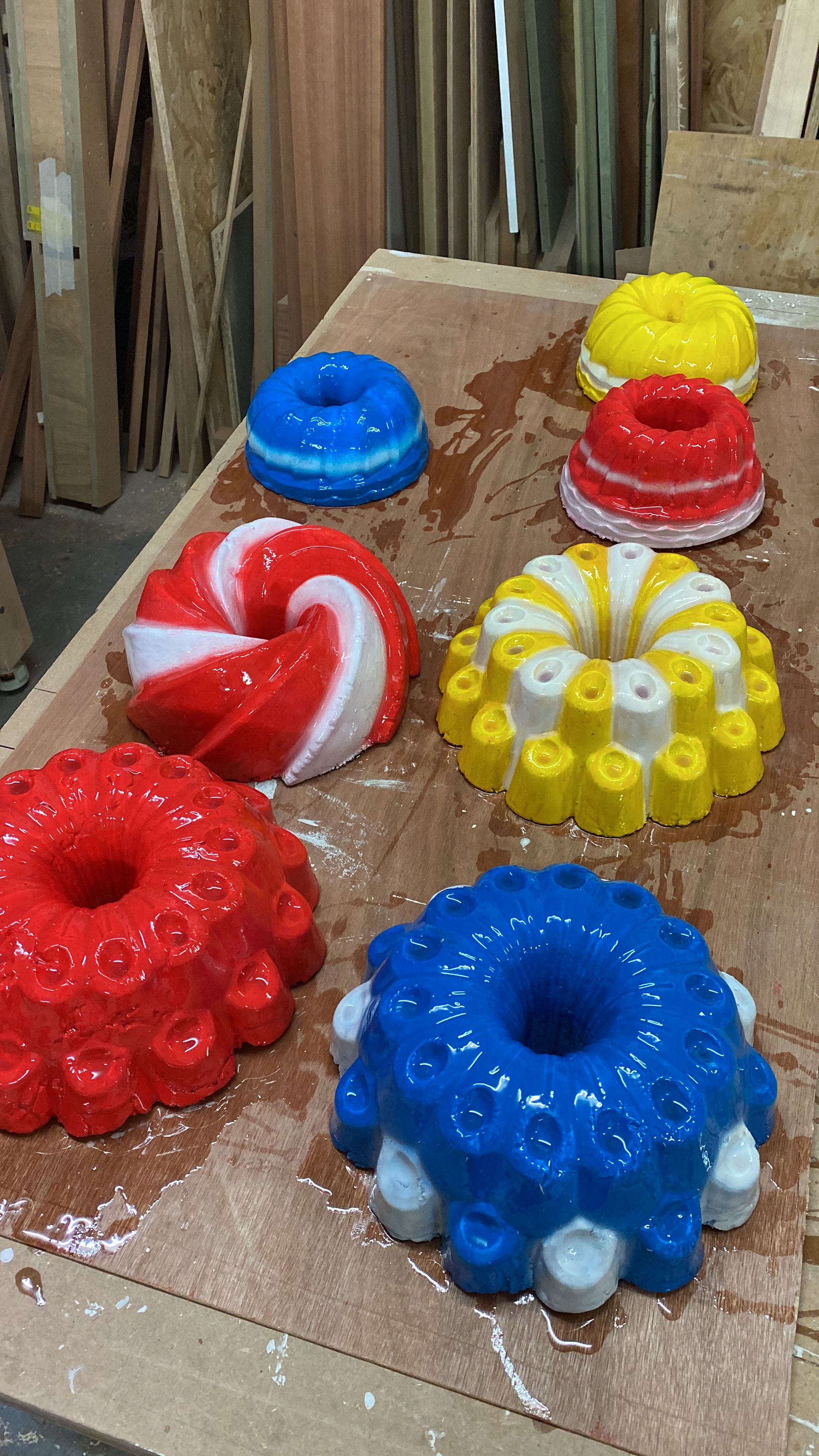 These lovely cakes were created using store-bought cake moulds filled with expanding foam. They are then individually painted with acrylic using an air brush and sealed with high-gloss varnish.