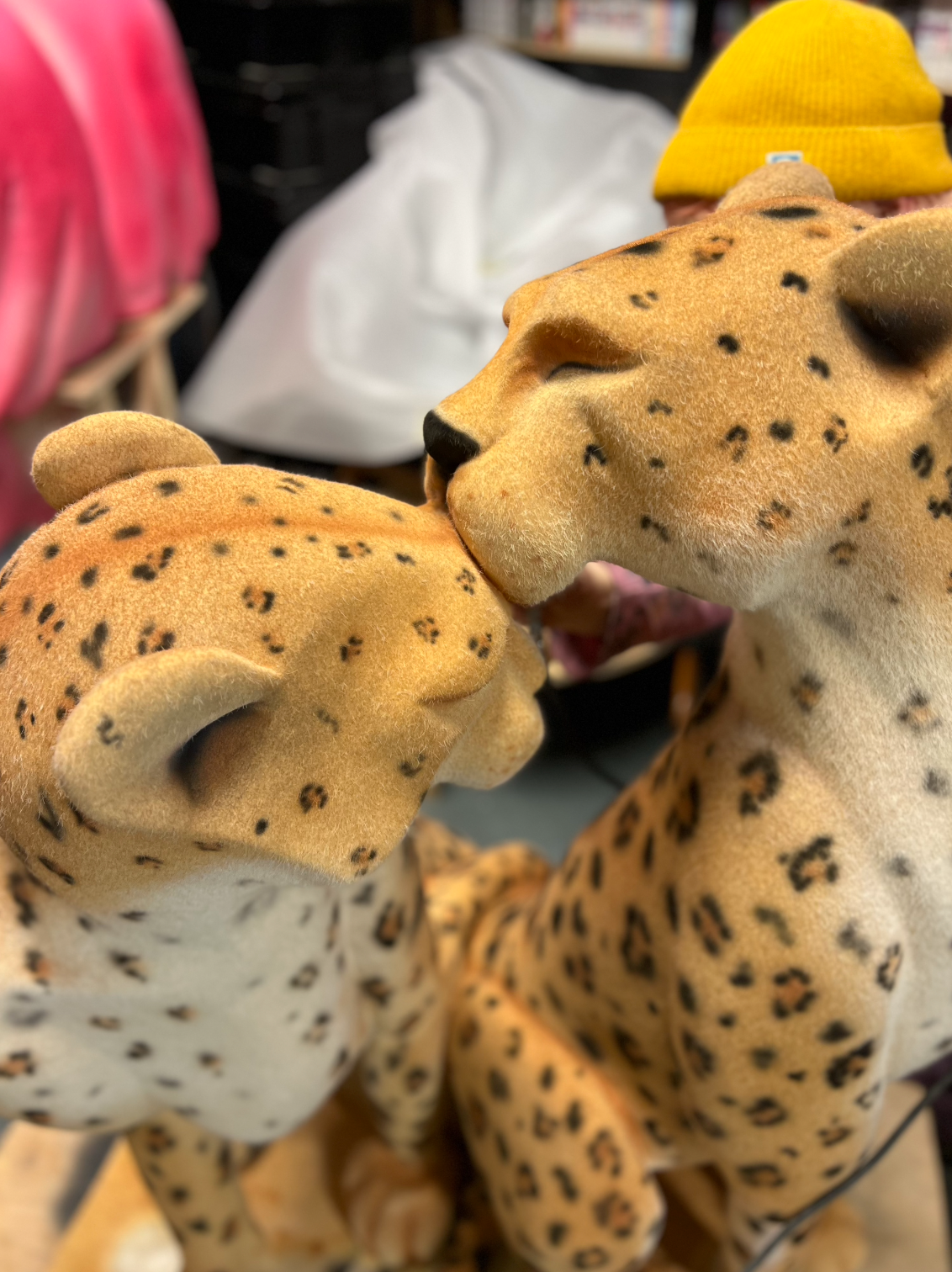 Polycarved and Jesmonited pair of love birds and cheetahs for a high-end restaurant's Valentines Day Decorations.